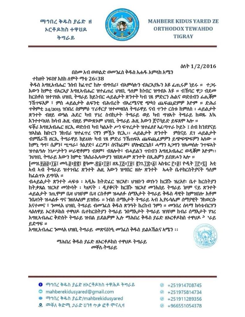 Mahbere Kidus Yared Ze Orthodox Tewahedo Tigray Statement